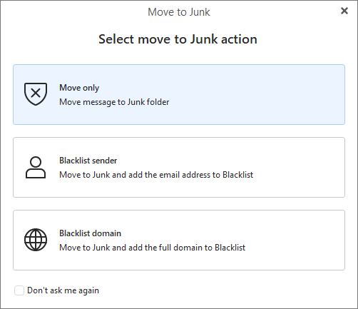 We redesigned the "Move to Junk" dialog so it’s clearer and your desired option is easier to select: