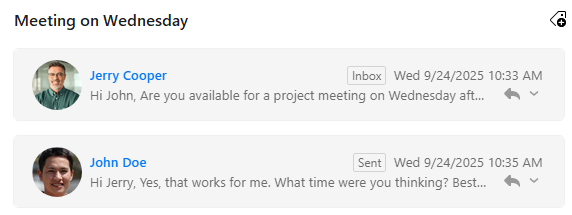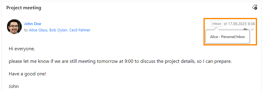 The folder name box is also displayed in Conversations, helping you quickly distinguish where each message from the thread is actually stored: