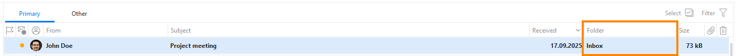 To show the Folder in the message list, right-click the top of the list, select “Columns configuration”, and add “Folder” to the displayed columns. Or hide it by removing it from the visible columns.
