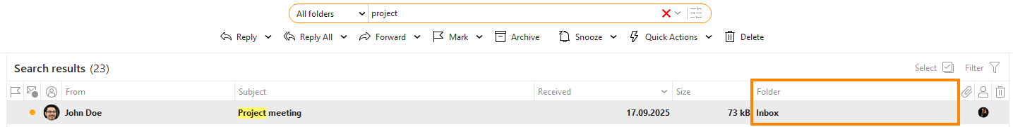 The Search feature now shows the message location in the search results list, in the Folder column. You will be able to see this in the “Messages on the bottom” layout and with the messages panel disabled. This is especially convenient if you use the search in the “All folders” option: