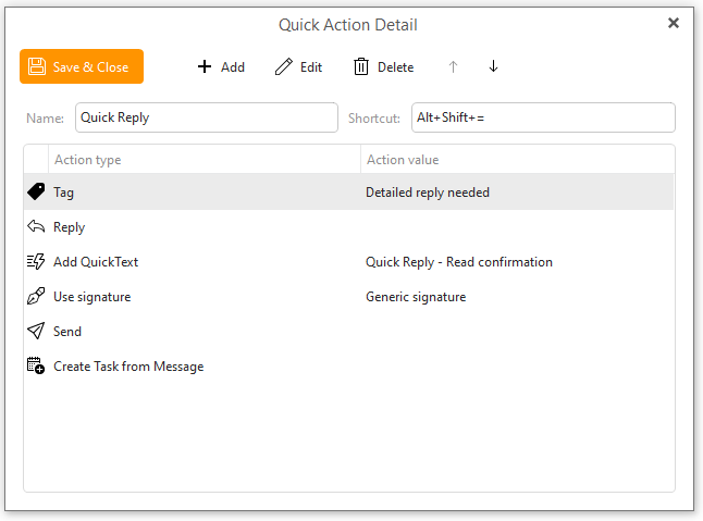 Tag - Reply - Add QuickText - Use signature - Send - Create Task from Message