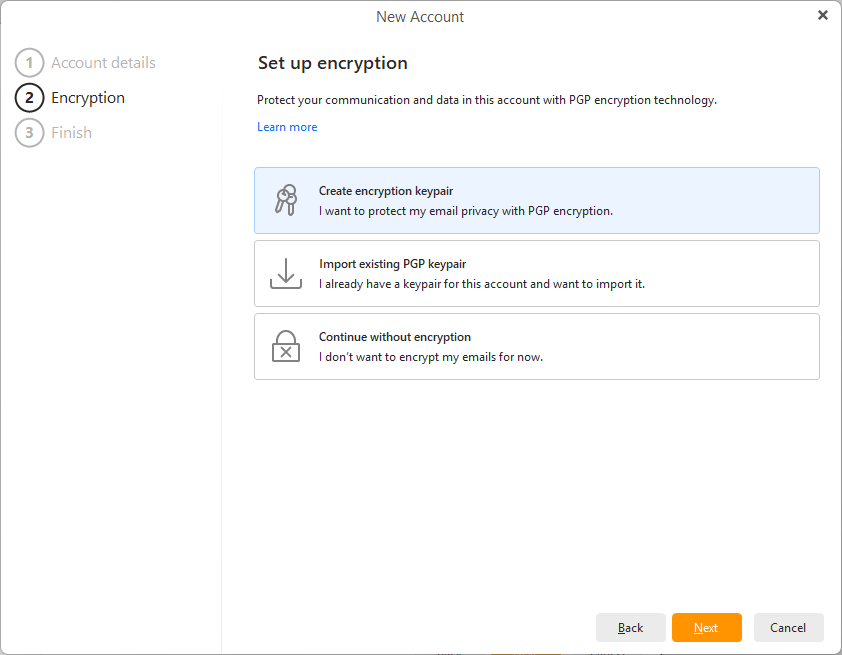 Set up encryption for your messages or skip this step. Find out more about PGP here.